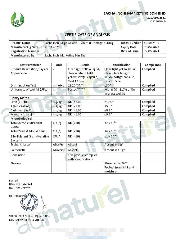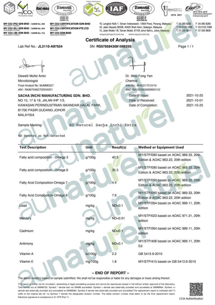 Au Naturel minyak sacha inchi Extra telah melalui 2 ujian kritikal makmal yang lengkap