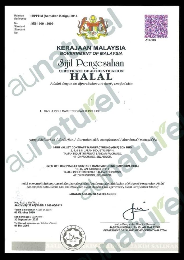 au naturel sacha inchi extra terbukti halal dan mempunyai sijil hala kilang berstatus GMP